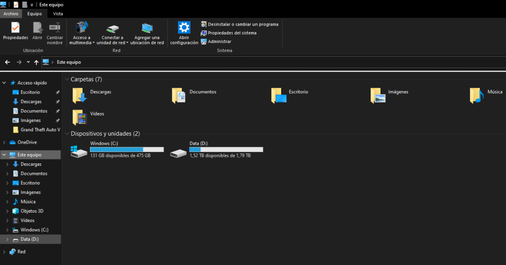 Luego tenemos estas dos unidades que son un solo disco de estado rígido en las cuales las tengo particionado en 21 la utilizo para trabajo uno lo utilizo para ocio para tener los juegos todo lo demás el cual está bastante también escaso de espacio ya me quedan menos de la mitad.