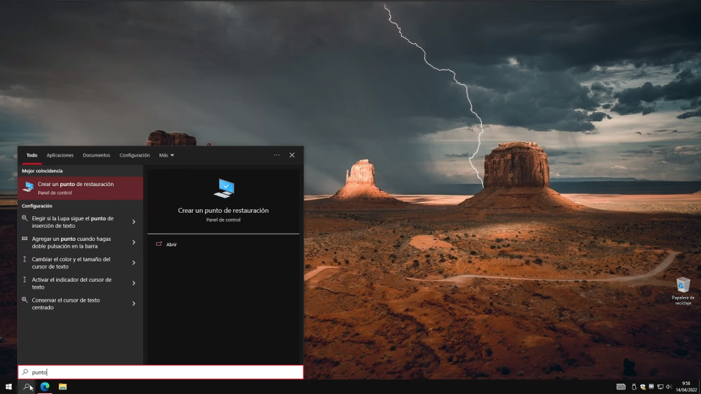 Lo primero que haremos por lo que pueda ocurrir es crear un punto de restauración, pero si siguen todos los pasos como lo realizaré yo en este articulo no tendrán ningún tipo de problema recuerden que para crear un punto de restauración en windows nos tenemos que dirigir a la lupa ya que simplemente pondremos punto de restauración.