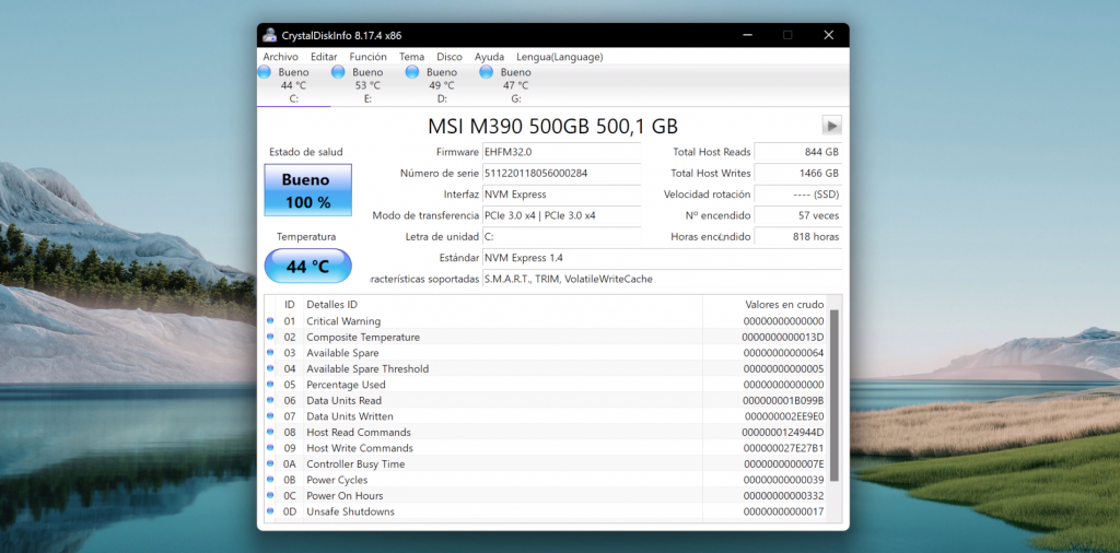 Lo importante es que veamos el estatus siempre de cada una de las unidades que tenemos instaladas y que siempre el estatus sea bueno 100% o muy similar a eso y por favor fíjense también en la cantidad de horas de uso y encendidos que tenga cada unidad ya que esto les dará la pauta de si realmente les vendieron unidades de almacenamiento nuevas o usadas a ver si la pc es nueva obviamente las unidades pueden tener 3, 4, 10 20 encendidos a lo sumo.