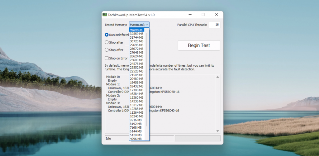 La idea sería por supuesto utilizar toda la memoria sin embargo tenga en cuenta que en estos casos la pc quedaría como inservible entre comillas mientras se haga el test porque toda la memoria va a estar alocada para la prueba, y bueno en cuanto al tiempo también es ideal dejar corriendo la prueba el mayor tiempo posible o por al menos un par de horas.