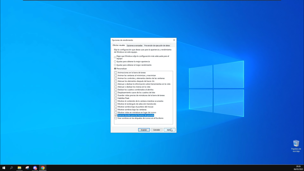 Nos aparecerá esta opción que pone ajusta la apariencia y rendimiento de windows pueden comprobar que yo tengo actualmente el apartado de rendimiento en personalizar pero ustedes pueden marcar ajustar para obtener el mejor rendimiento y luego marcar esta opción que pone suavizar bordes para las fuentes de pantalla aplican y aceptan de esta forma podrán aprovechar al máximo los recursos de windows porque estamos desactivando cosas como las animaciones, efectos …