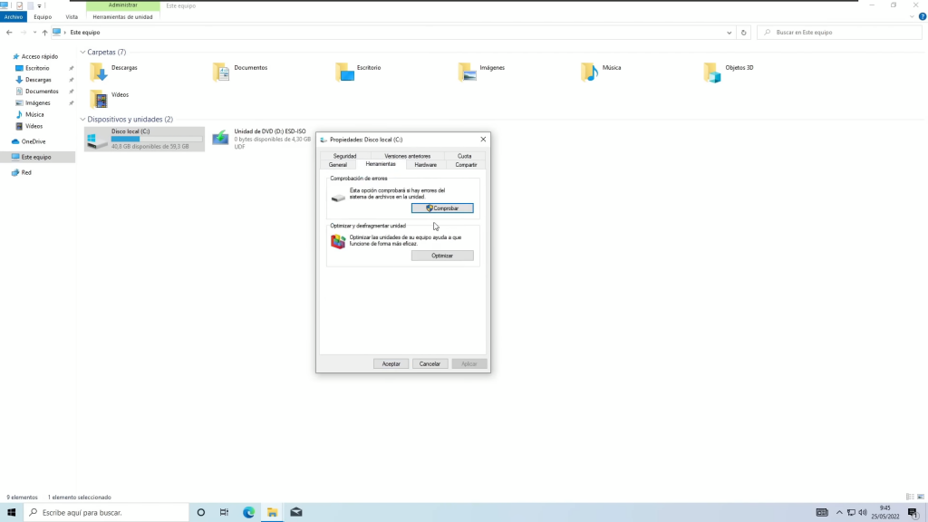 Lo primero que haremos será comprobar que nuestra unidad de almacenamiento no tiene ningún tipo de problema y esto también lo podemos comprobar sin ningún tipo de programa para ello nos vamos a este equipo aquí escogemos el disco local se propiedades, y en propiedades vamos a ir a la opción que pone herramientas.