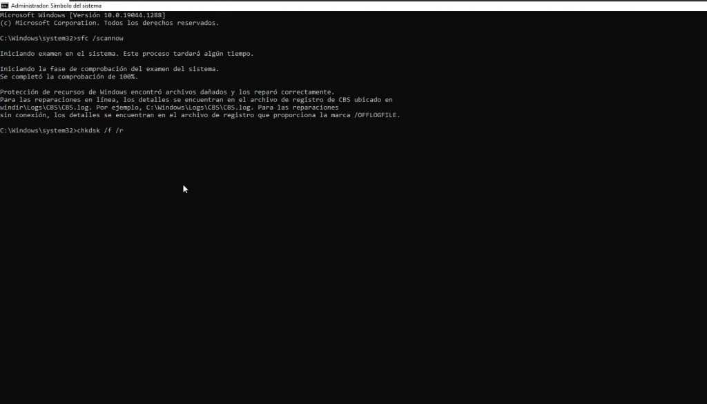 Damos un enter y con este comando lo que haremos será reparar archivos dañados, nosotros simplemente esperamos a que concluye el proceso y ya luego podemos continuar con el siguiente comando.