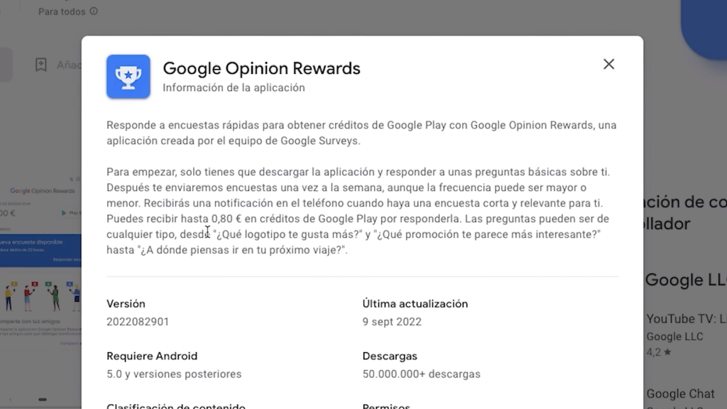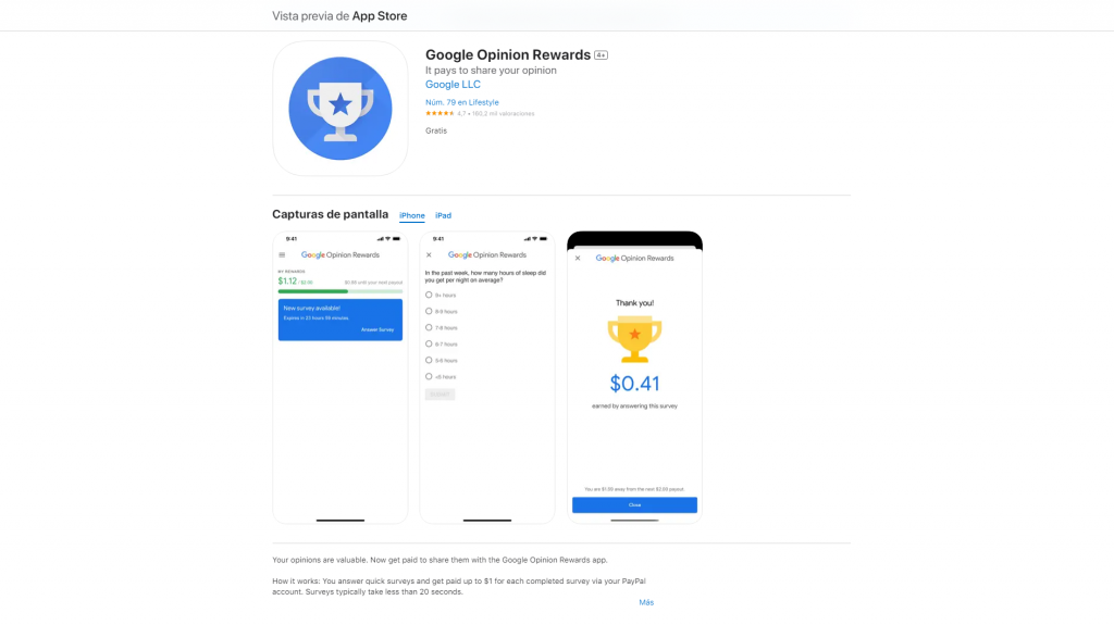 La siguiente aplicación se llama Google opinion rewards y en este caso consiste en una aplicación que te va a pagar por completar encuestas, estoy seguro de que has visto un montón de páginas webs que supuestamente te pagan por completar encuestas pero que finalmente pues solo una estafa o no funcionan en este caso estamos hablando de una aplicación del propio Google que te va a ofrecer encuestas y que te va a permitir ganar dinero por cada encuesta que contestes.